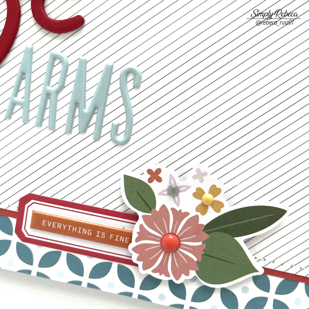 To create the title I mixed different products, this will give the page more interest and texture. The word "Safe" was made using naked chipboards from Basic Gray. These are really old but I still have a few packs of this and other of their fonts and I really like them because the font styles are beautiful and I can color them with different mediums. This time, I used red acrylic paint. For the "in your" section I used stickers from Elle's Studio, and for "Arms" I used puffy alphas from Pinkfresh Studio.